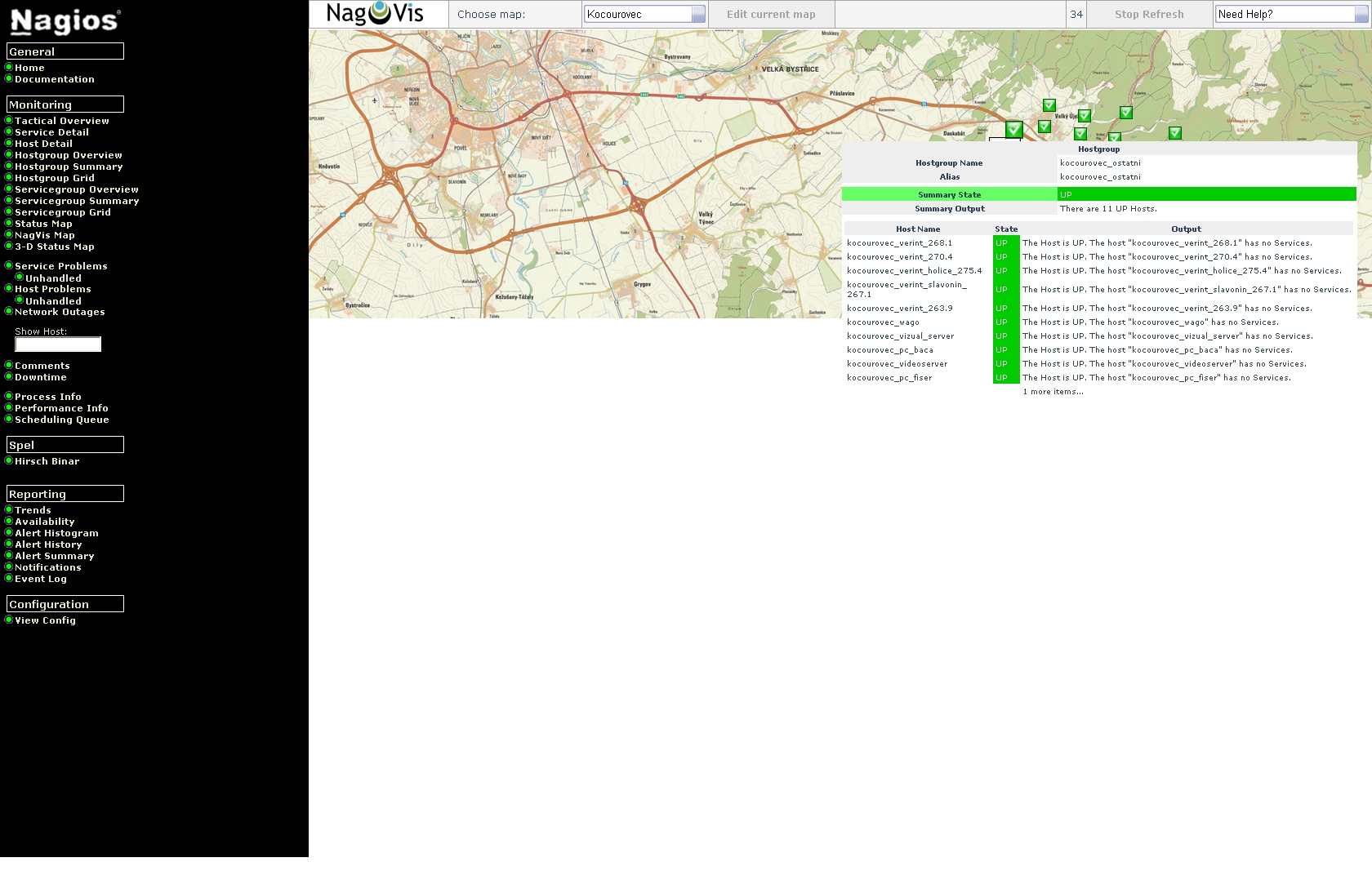 Bohužel žádná ethernetová síť nemůže být provozována bez monitoringu stavu jednotlivých prvků. A pro sítě, které zaručují např. bezpečnost silničního provozu, to platí o to víc. Díky sledování stavu sítě lze vyřešit případný vzniklý problém v co nejkratší době. Pro základní monitoring námi servisovaných sítí využíváme systém Nagios, který automaticky sleduje jednotlivá zařízení v síti (SOS hlásky, klientské počítače, servery, PLC, UPS,…) a na nich spuštěné služby.
